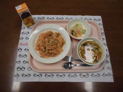 チキンライス・みかんジュース・白いんげん豆の田舎風スープ・