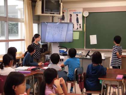 世田谷区は、各学校にタブレット40台、各教室に大型テレビ・電子黒板を配置しています。本校も、これらICT機器を活用した授業作りを積極的に進めています。