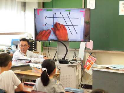 校内研究の専科分科会は、4年生の算数授業を行いました。既習事項を用いて、線で描かれた図形の中から台形をさがす授業です。自分が見つけた台形について、定義を用いて友達と説明し合い、互いの考えを伝え合うことができました。
