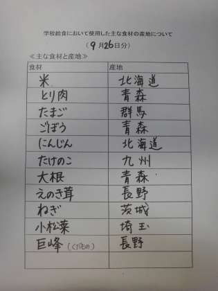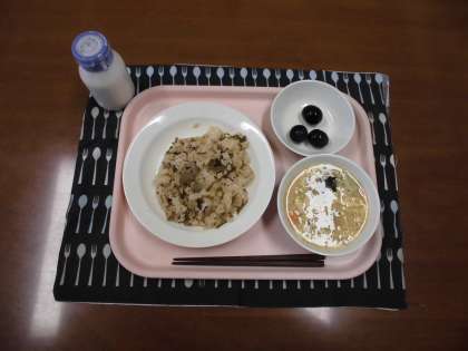 鶏肉とごぼうのごはん・牛乳・かきたま汁・果物(巨峰) です。