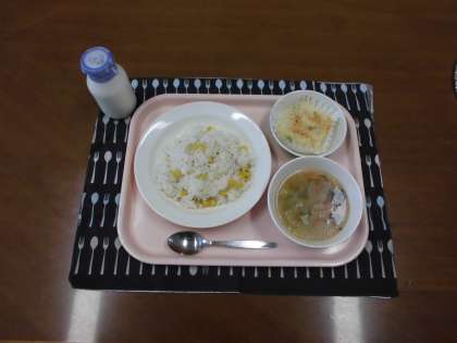コーンライス・牛乳・ポテトのクリーム焼き・コンソメスープ です。