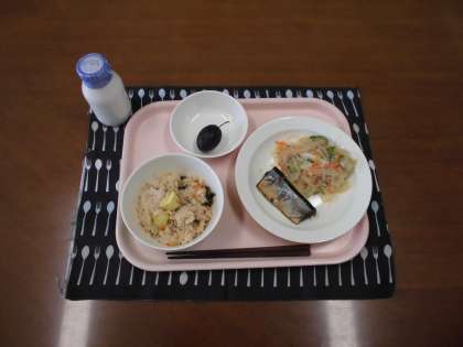 「秋の香りごはん」にはさつまいも・栗・しめじを、「魚の松前煮」ではさんまを、果物にはプルーンを付けました。