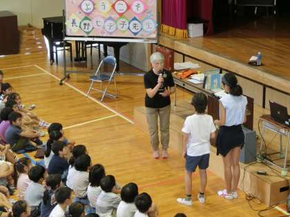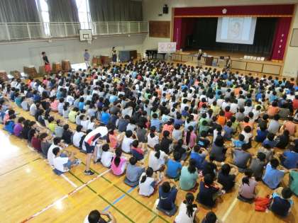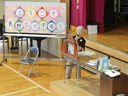 全校児童に向けて絵本や紙芝居の読み聞かせをしていただいたり、子どもの頃のお話をしていただいたりしました。