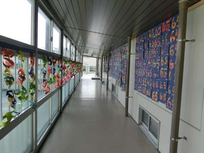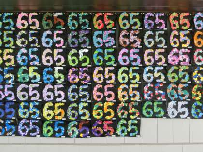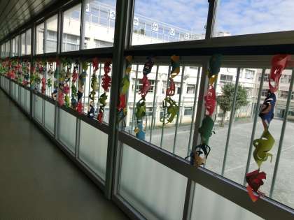 開校65周年のお祝いに、子どもたちは「65」にちなんだ装飾を制作し、体育館前の通路にかざりました。