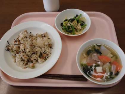 五目ごはん・牛乳・きのこ入り煮びたし・吉野汁 です。
