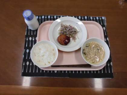 ごはん・牛乳・豆腐のナゲット・キャベツのゆかりかけ・
