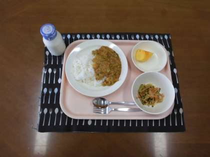 ひよこ豆のカレーライス・牛乳・かみかみサラダ・果物(柿) です。