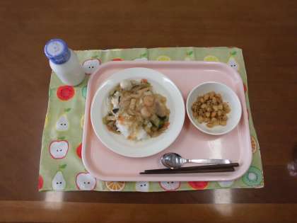 中華丼・牛乳・大豆とじゃこの甘辛揚げ です。