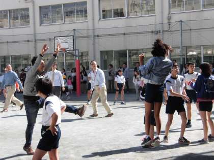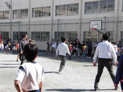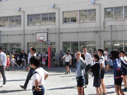 毎月ある土曜授業日のロング中休みには、仲間る会を中心にお父さん方が参加してくださり、ドッジボールで楽しみます。10月は、6年生でした。お父さん達も子ども達も、真剣勝負!!