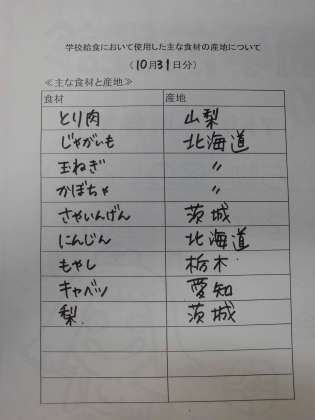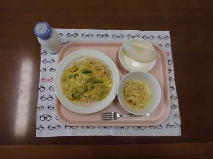読書週間に合わせた献立、3回目の今日は「月ようびはなにたべる?」より「さやいんげん」を使った献立です。先週の金曜に続いて月ようの食べ物は「さやいんげん」。今日はスパゲティーパンプキンクリームソースの中に入れました。ちなみにパンプキンは英語で、かぼちゃのこと。夏野菜のひとつですが、保存できるので、12月の冬至に食べるのは習慣をしてありますが、最近はハロウィンにちなんで食べることもありますね。今日の給食もちなんでいるのですが。