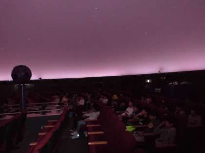 プラネタリウムでの天文学習では、ドーム内に中丸小学校の映像が映し出され、「わあー、すごい。」と驚きの声が上がりました。