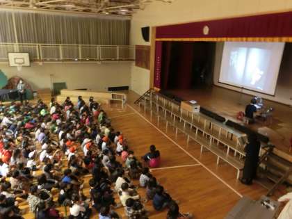 全校朝会にて、校長先生から「花さき山」の読み聞かせがありました。