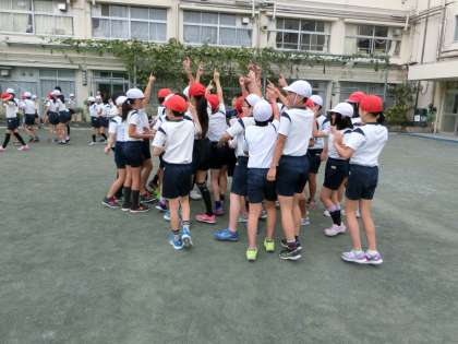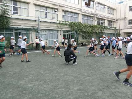 全クラス、校庭で2回ずつ、記録の計測を行いました。