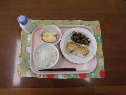 今日の魚は「銀ヒラス」、果物のりんごは「ジョナゴールド」という種類を使いました。