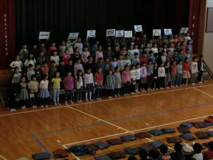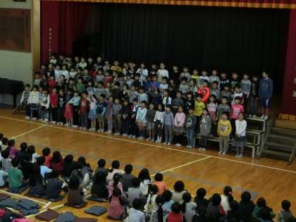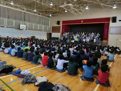 全校児童で群読発表会をし、日本語の授業中に取り組んだ暗唱の成果を発表しました。どの学年も声をそろえ、体育館に響き渡る群読となりました。学芸会の取組が、しっかりと身に付いています。