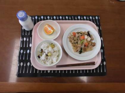 さつまいもごはん・牛乳・すき焼き煮・果物(みかん) です。
