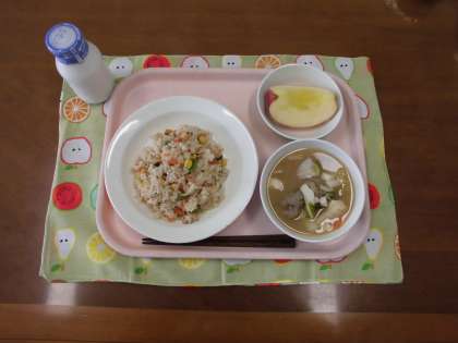 そぼろごはん・牛乳・いわしのつみれ汁・果物(りんご) です。