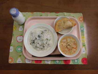 わかめごはん・牛乳・ジャンボぎょうざ・卵スープ です。
