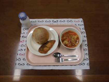 ビスキュイパン・牛乳・ボルシチ・魚のスパイス揚げ です。