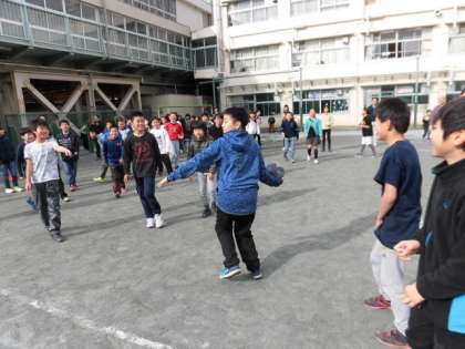 今日のロング中休みには、5年生と「仲間る会」のお父さん方がドッジボールを楽しみました。