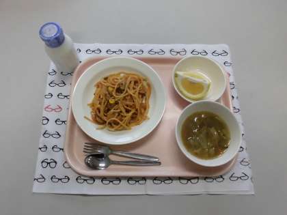 今日の献立は、スパゲティーナポリタン・牛乳・コンソメスープ・果物(はるか) です。