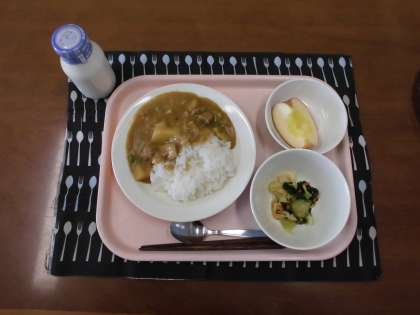 今日の献立は、チキンカレーライス・牛乳・和風サラダ・果物(りんご) です。