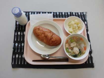 今日の献立は、揚げパン(シナモン)・牛乳・肉団子入り春雨スープ・コーンポテト です。