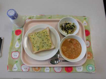 今日の献立は、ルイユトースト・牛乳・ビーンズシチュー・青菜とコーンのソテー です。