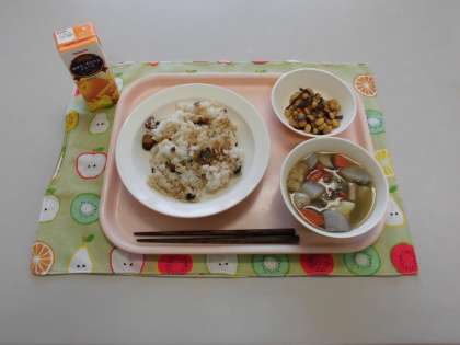 今日の献立は、いわしごはん・みかんジュース・けんちん汁・こんぶ豆 です。