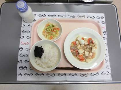 今日の献立は、ごはん・牛乳・のりの佃煮・豆腐の五目炒め・野菜のごま酢あえ です。