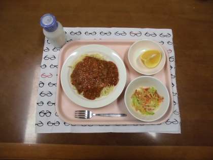 今日の献立は、スパゲティーミートソース・牛乳・じゃがいものハニーサラダ・果物(はっさく) です。