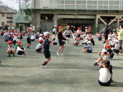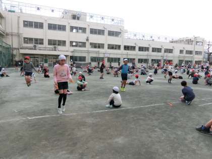 校庭で短なわ大会を行いました。前半は1〜3年生の部で30分間、後半は4〜6年生の部で30分間でした。