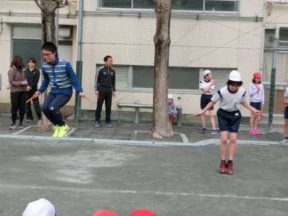 4〜6年生の部では個人戦では二重跳び、前あや跳び、はやぶさ、前交差跳び、三重跳びの中からどれか1種目に参加をしました。その後、クラス対抗二重跳びリレーには、先生チームも一緒に参加をしました。