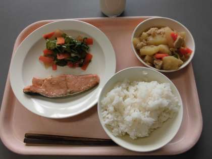 今日の献立は、ごはん・牛乳・魚の梅肉焼き・野菜のおかかあえ・じゃがいものそぼろ煮 です。