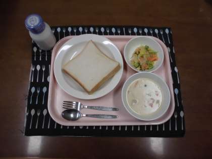 今日の献立 ジャムサンド(マーマレード)・牛乳・コーンシチュー・フレンチサラダ