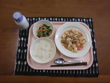 1年生は今日まで慣らし給食です。ごはん・牛乳・家常豆腐です。