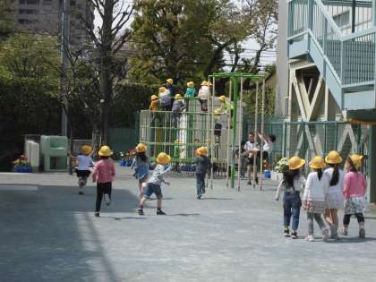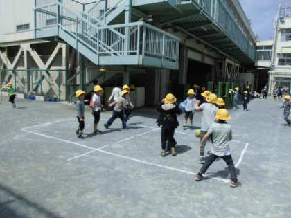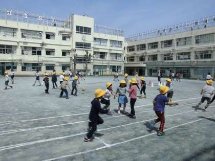 中休みは、初めて休み時間に校庭で遊ぶことができました。黄色いぼうしを目印にして鉄棒、うんてい、ジャングルジム、長縄、ドッジボールと校庭を元気いっぱい走り回り遊びました。