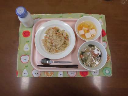 今日の献立 中華おこわ・牛乳・ワンタンスープ・杏仁豆腐