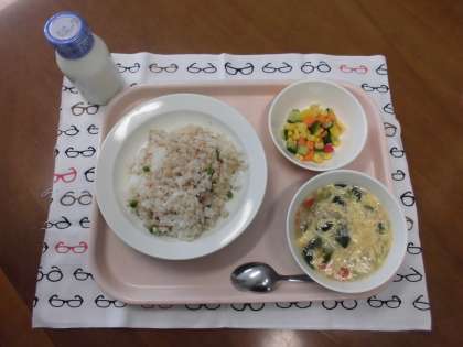 鮭ピラフ・牛乳・卵スープ・トロピカルサラダ