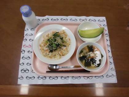 今日の献立 ビビンバ・牛乳・春雨スープ・果物(メロン)