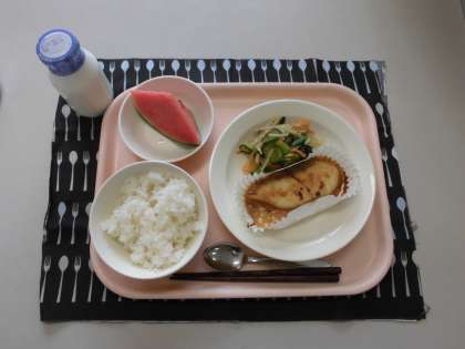 ごはん・牛乳・魚のみそマヨネーズ焼き・糸寒天と野菜のあえもの・果物(小玉スイカ)