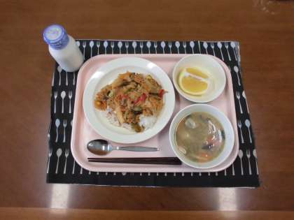 夏のキムチ丼・牛乳・ワンタンスープ・果物(河内晩柑)