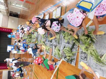 栄養士の飯野先生にとうもろこしのお話を聞き、さあ、皮むき開始!