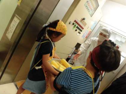 さあ、給食です。黄色に蒸かされたとうもろこしを、にこにこで食べました。