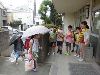 2学期最初のあいさつリーダーは、2地区9班と6地区4班のみなさんです。あいにくの天気でしたが、リーダーのみんなは東昇降口と北昇降口に分かれて、元気よくあいさつをしました。