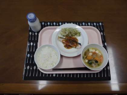 ごはん・牛乳・魚の甘酢あんかけ・野菜のごま風味・中華スープ