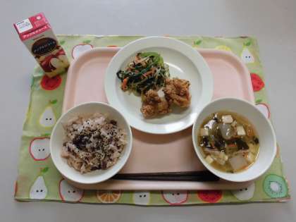 赤飯・りんごジュース・鶏肉のから揚げ・沢煮椀・青菜ののりあえ