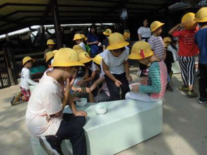 午前中は、ハツカネズミやモルモット、ニワトリをだっこして、小動物に触れ合いました。