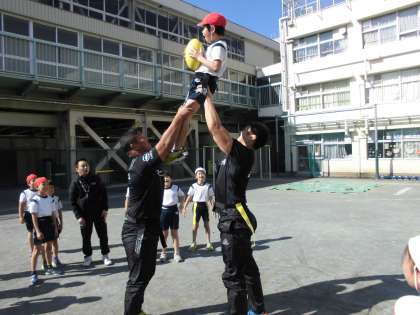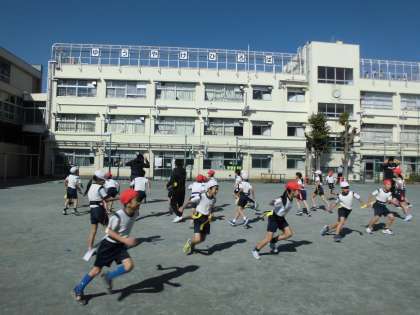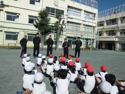 体育の授業の一環として、タグラグビー教室をおこないました。今回はゲストティーチャーとして、Black Ramsの選手とスタッフの方が来てくださり、一緒に体を動かしました。選手と一緒にパスゲームをしたり、実際にタグをつけてミニゲームをしたり、ボールを高く蹴り上げるパフォーマンスを見せていただいたり、とても楽しい時間になりました。
