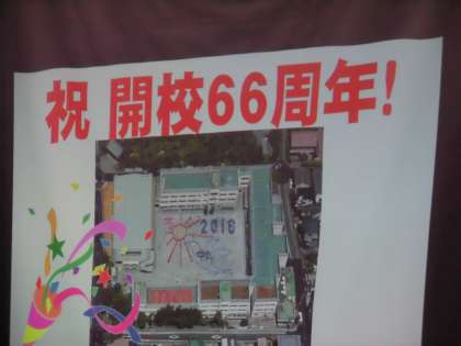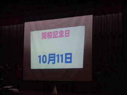 開校記念日集会は、代表委員会による楽しい学校歴史クイズで始まりました。クイズに答えることで、学校の歴史に興味をもったり、66年前の学校や地域を知ったりすることができました。